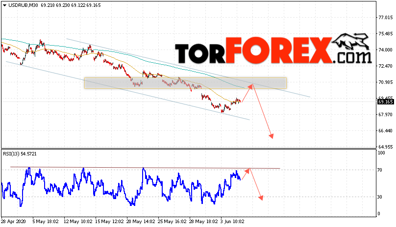 Дополнительным сигналом в пользу падения валютной пары USD/RUB 5 июня 2020 выступит тест линии сопротивления на индикаторе относительной силы. Вторым сигналом станет отскок от верхней границы нисходящего канала. Отменой варианта падения пары USD/RUB на Форекс станет сильный рост и пробой уровня 71.45. Рублей за Доллар. Это укажет на пробой области сопротивления и продолжение подъёма пары Доллар Рубль в область выше уровня 73.75. Подтверждением падения пары выступит пробой области поддержки и закрытие под уровнем 67.55.