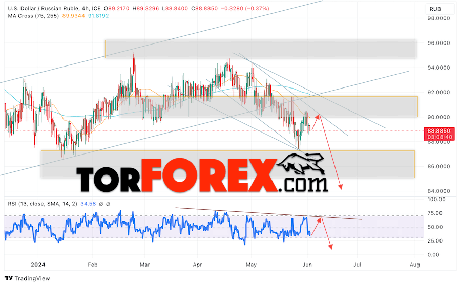 Дополнительным сигналом в пользу снижения валютной пары USD/RUB 5 июня 2024 выступит тест линии тренда на индикаторе относительной силы. Вторым сигналом станет отскок от верхней границы медвежьего канала. Отменой варианта падения пары USD/RUB на Форекс станет сильный рост котировок и пробой уровня 92.65 Рублей за Доллар. Это укажет на пробой области сопротивления и продолжение роста пары Доллар Рубль в область выше уровня 97.55. Подтверждением падению пары выступит пробой области поддержки и закрытие котировок актива под уровнем 87.35.