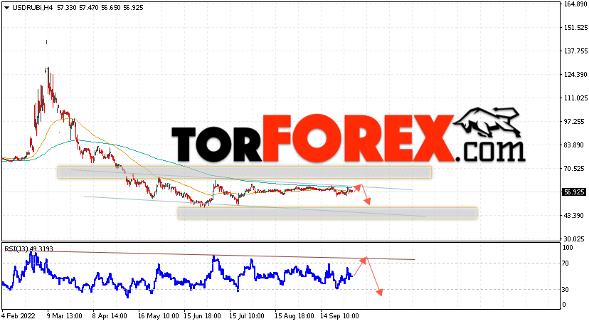 Дополнительным сигналом в пользу падения валютной пары USD/RUB 5 октября 2022 выступит тест линии тренда на индикаторе относительной силы. Вторым сигналом станет отскок от верхней границы нисходящего канала. Отменой варианта падения пары USD/RUB на Форекс станет сильный рост котировок и пробой уровня 59.05 Рублей за Доллар. Это укажет на пробой области сопротивления и продолжение роста пары Доллар Рубль в область выше уровня 63.55. Подтверждением падению пары выступит пробой области поддержки и закрытие котировок актива под уровнем 53.45.