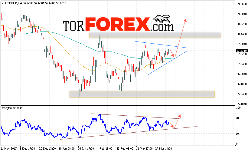 В пользу роста пары USD/RUB выступит тест восходящей линии тренда на индикаторе относительной силы. Отменой варианта роста пары USD/RUB на Форекс станет падение и пробой уровня 56.80 Рублей за Доллар, что укажет на пробой области поддержки и продолжение падения пары Доллар Рубль в область ниже уровня 56.50. Подтверждением развития восходящей тенденции по паре выступит пробой верхней границы модели «Треугольник» и закрытие котировок выше уровня 58.10.