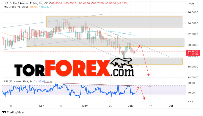 Дополнительным сигналом в пользу снижения валютной пары USD/RUB 6 июня 2024 выступит тест линии тренда на индикаторе относительной силы. Вторым сигналом станет отскок от верхней границы медвежьего канала. Отменой варианта падения пары USD/RUB на Форекс станет сильный рост котировок и пробой уровня 92.75 Рублей за Доллар. Это укажет на пробой области сопротивления и продолжение роста пары Доллар Рубль в область выше уровня 96.45. Подтверждением падению пары выступит пробой области поддержки и закрытие котировок актива под уровнем 87.55.