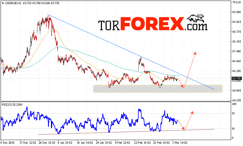 Таким образом, USD/RUB прогноз курса Доллара на 6 марта 2019 предполагает попытку теста уровня поддержки вблизи области 65.00. Откуда стоит ожидать отскок и продолжения роста курса Доллара против Рубля с целью выше уровня 67.45. Дополнительным сигналом в пользу подъёма пары выступит тест области поддержки на индикаторе относительной силы. Отменой варианта роста станет пробой области поддержки и закрытие котировок ниже уровня 64.45.