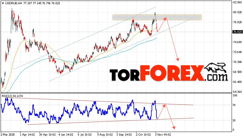 Дополнительным сигналом в пользу падения валютной пары USD/RUB 6 ноября 2020 выступит тест линии сопротивления на индикаторе относительной силы. Вторым сигналом станет завершение формирования разворотной модели ”Голова и плечи”. Отменой варианта падения пары USD/RUB на Форекс станет сильный рост и пробой уровня 81.25. Рублей за Доллар. Это укажет на пробой области сопротивления и продолжение роста пары Доллар Рубль в область выше уровня 83.55. Подтверждением падения пары выступит пробой области поддержки и закрытие котировок актива под уровнем 75.05.