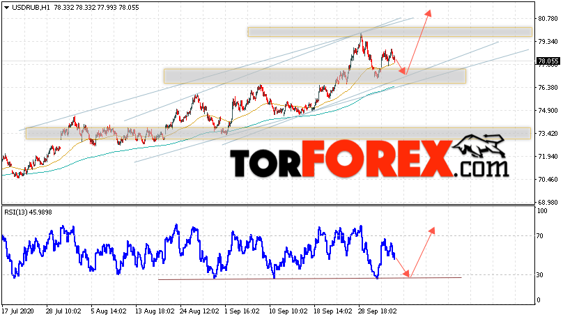 Дополнительным сигналом в пользу роста валютной пары USD/RUB 6 октября 2020 выступит тест линии поддержки на индикаторе относительной силы. Вторым сигналом станет отскок от нижней границы восходящего канала. Отменой варианта подъёма пары USD/RUB на Форекс станет падение и пробой уровня 75.25. Рублей за Доллар. Это укажет на пробой области поддержки и продолжение падения пары Доллар Рубль в область ниже уровня 72.75. Подтверждением роста пары выступит пробой области сопротивления и закрытие котировок актива над уровнем 79.65.