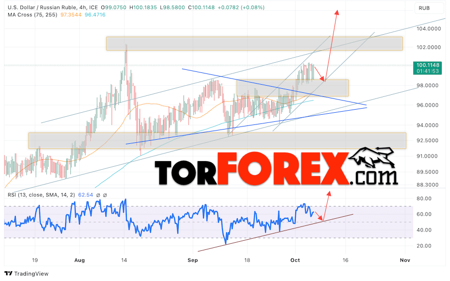 Валютная пара Доллар Рубль USD/RUB продолжает движение в рамках роста и начала отработки модели «Треугольник». В момент публикации прогноза курс Доллара США к Российскому Рублю составляет 100.11. Скользящая средняя указывают на наличие краткосрочной бычьей тенденции. Цены пробили область между сигнальными линиями вверх, что указывает на давление со стороны покупателей американской валюты и потенциальное продолжение роста Доллара США против Российского Рубля. В рамках прогноза курса Доллара на 6 октября 2023 стоит ожидать попытку развития коррекции цены и тест уровня поддержки вблизи области 98.25 Рублей за Доллар США. Затем, отскок вверх и продолжение роста валютной пары в область выше уровня 105.75.