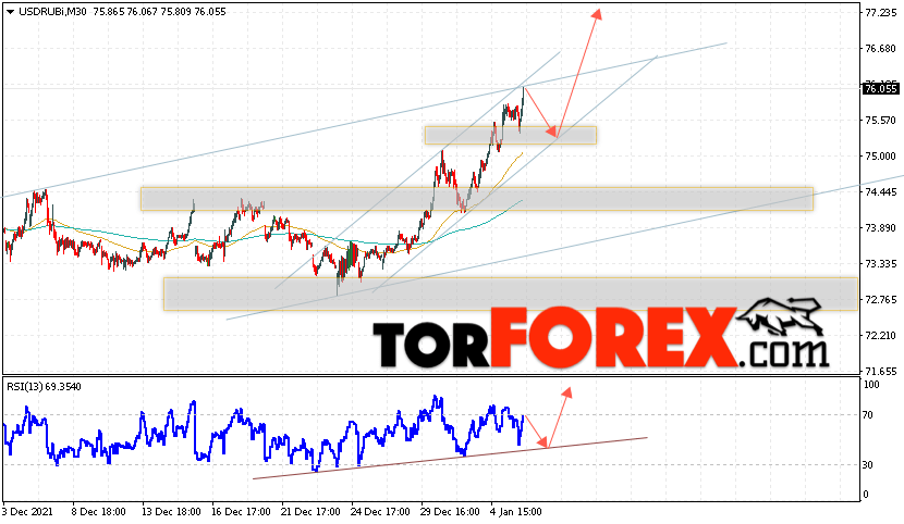 Дополнительным сигналом в пользу роста валютной пары USD/RUB 6 января 2022 выступит тест линии тренда на индикаторе относительной силы. Вторым сигналом станет отскок от нижней границы бычьего канала. Отменой варианта подъёма пары USD/RUB на Форекс станет падение и пробой уровня 74.65 Рублей за Доллар. Это укажет на пробой области поддержки и продолжение падения пары Доллар Рубль в область ниже уровня 72.05. Подтверждением подъёма пары выступит пробой области сопротивления и закрытие котировок актива над уровнем 75.55, что укажет на пробой верхней границы бычьего канала.