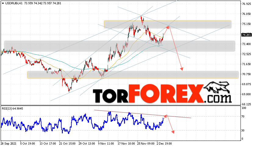 Дополнительным сигналом в пользу снижения валютной пары USD/RUB 7 декабря 2021 выступит тест нисходящей линии тренда на индикаторе относительной силы. Вторым сигналом станет отскок от нижней границы бычьего канала. Отменой варианта падения пары USD/RUB на Форекс станет сильный рост и пробой уровня 76.35 Рублей за Доллар. Это укажет на пробой области сопротивления и продолжение роста пары Доллар Рубль в область выше уровня 78.55. Подтверждением падения пары выступит пробой области поддержки и закрытие котировок актива под уровнем 72.25.