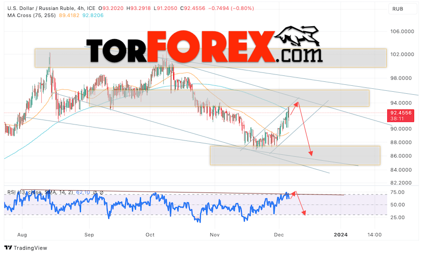 Валютная пара Доллар Рубль USD/RUB продолжает движение в рамках развития бычьей коррекции и медвежьего канала. В момент публикации прогноза курс Доллара США к Российскому Рублю составляет 92.45. Скользящие средние указывают на наличие краткосрочной медвежьей тенденции. Цены вновь тестируют область между сигнальными линиями, что указывает на давление со стороны продавцов американской валюты и потенциальное продолжение падения Доллара США против Российского Рубля. В рамках прогноза курса Доллара на 7 декабря 2023 стоит ожидать попытку развития бычьей коррекции цены и тест уровня сопротивления вблизи области 93.85 Рублей за Доллар США. Затем, отскок вниз и продолжение падения валютной пары в область ниже уровня 85.95.