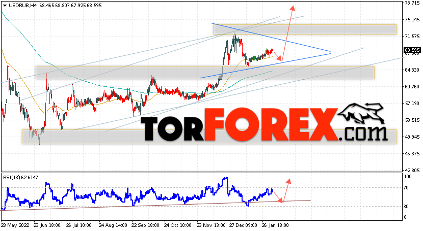 Дополнительным сигналом в пользу подъёма валютной пары USD/RUB 7 февраля 2023 выступит тест бычьей линии тренда на индикаторе относительной силы. Вторым сигналом станет отскок от нижней границы модели ”Треугольник”. Отменой варианта роста пары USD/RUB на Форекс станет падение котировок и пробой уровня 63.35 Рублей за Доллар. Это укажет на пробой области поддержки и продолжение падения пары Доллар Рубль в область ниже уровня 58.35. Подтверждением росту пары выступит пробой области сопротивления и закрытие котировок актива над уровнем 71.95, что укажет на пробой верхней границы модели ”Треугольник” и начало отработки паттерна с целями вверху.