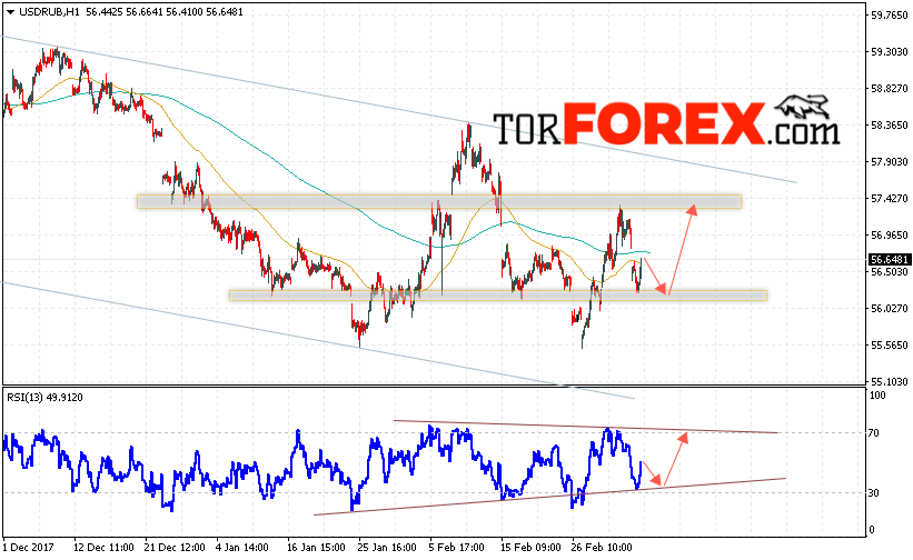 Таким образом, USD/RUB прогноз курса Доллара на 7 марта 2018 предполагает попытку теста уровня поддержки вблизи области 56.20, откуда стоит ожидать отскок и попытку продолжения роста курса Доллара против Рубля с целью выше уровня 57.45, в рамках начала отработки бычьей модели «5-0», дополнительным сигналом в пользу роста пары выступит тест линии тренда на индикаторе относительной силы.