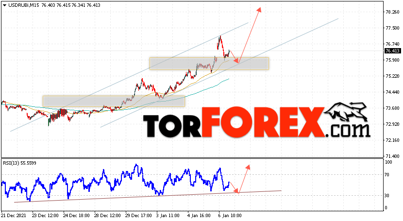 Дополнительным сигналом в пользу роста валютной пары USD/RUB 7 января 2022 выступит тест линии тренда на индикаторе относительной силы. Вторым сигналом станет отскок от нижней границы бычьего канала. Отменой варианта подъёма пары USD/RUB на Форекс станет падение и пробой уровня 75.05 Рублей за Доллар. Это укажет на пробой области поддержки и продолжение падения пары Доллар Рубль в область ниже уровня 73.45. Подтверждением подъёма пары выступит пробой области сопротивления и закрытие котировок актива над уровнем 77.45.