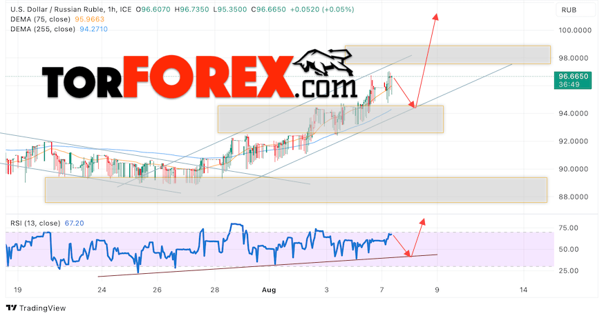 Валютная пара Доллар Рубль USD/RUB продолжает движение в рамках роста и бычьего канала. В момент публикации прогноза курс Доллара США к Российскому Рублю составляет 96.66. Скользящие средние указывают на наличие краткосрочной бычьей тенденции. Цены пробили область между сигнальными линиями вверх, что указывает на давление со стороны продавцов американской валюты и потенциальное продолжение падения Доллара США против Российского Рубля. В рамках прогноза курса Доллара на 8 августа 2023 стоит ожидать попытку развития коррекции цены и тест уровня поддержки вблизи области 94.25 Рублей за Доллар США. Затем, отскок вверх и продолжение роста валютной пары в область выше уровня 101.65.