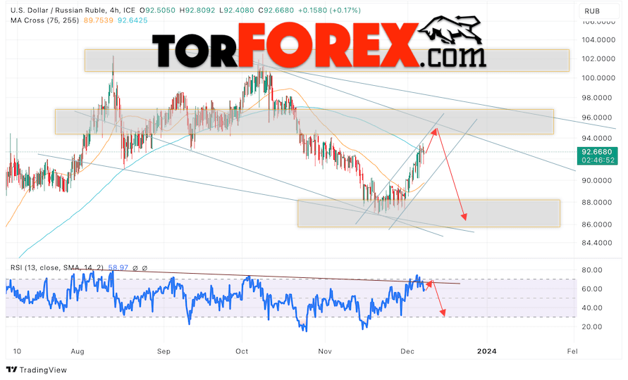 Дополнительным сигналом в пользу падения валютной пары USD/RUB 8 декабря 2023 выступит тест линии тренда на индикаторе относительной силы. Вторым сигналом станет отскок от верхней границы медвежьего канала. Отменой варианта снижения пары USD/RUB на Форекс станет сильный рост котировок и пробой уровня 96.95 Рублей за Доллар. Это укажет на пробой области сопротивления и продолжение роста пары Доллар Рубль в область выше уровня 99.65. Подтверждением падению пары выступит пробой области поддержки и закрытие котировок актива под уровнем 90.05, что укажет на пробой нижней границы бычьего канала коррекции.