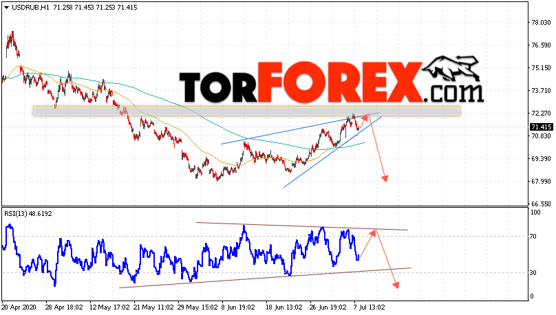 Дополнительным сигналом в пользу падения валютной пары USD/RUB 8 июля 2020 выступит тест линии сопротивления на индикаторе относительной силы. Вторым сигналом станет отскок от верхней границы модели «Клин». Отменой варианта падения пары USD/RUB на Форекс станет сильный рост и пробой уровня 74.05. Рублей за Доллар. Это укажет на пробой области сопротивления и продолжение подъёма пары Доллар Рубль в область выше уровня 76.55. Подтверждением падения пары выступит пробой области поддержки и закрытие под уровнем 69.15, что укажет на пробой нижней границы модели «Клин».