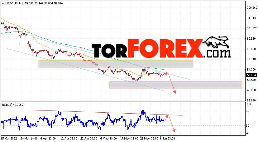 Дополнительным сигналом в пользу падения валютной пары USD/RUB 7 июня 2022 выступит тест нисходящей линии тренда на индикаторе относительной силы. Вторым сигналом станет отток от верхней границы нисходящего канала. Отменой варианта падения пары USD/RUB на Форекс станет сильный рост котировок и пробой уровня 66.55 Рублей за Доллар. Это укажет на пробой области сопротивления и продолжение роста пары Доллар Рубль в область выше уровня 72.45. Подтверждением падению пары выступит пробой области поддержки и закрытие котировок актива под уровнем 56.55.