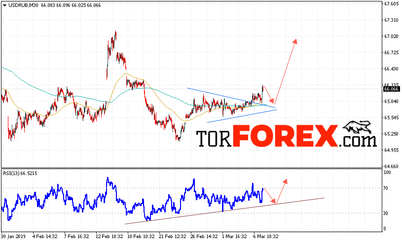 В пользу роста пары USD/RUB выступит тест линии поддержки на индикаторе относительной силы. Вторым сигналом станет отскок от верхней границы модели «Треугольник». Отменой варианта подъёма пары USD/RUB на Форекс станет падение и пробой уровня 65.55 Рублей за Доллар. Это укажет на пробой области поддержки и продолжение падения пары Доллар Рубль в область ниже уровня 64.65. Подтверждением роста пары выступит пробой области сопротивления и закрытие выше уровня 66.65.