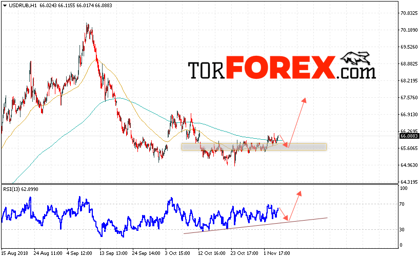 Таким образом, USD/RUB прогноз курса Доллара на 8 ноября 2018 предполагает попытку теста уровня поддержки вблизи области 65.60, откуда стоит ожидать отскок и продолжения роста курса Доллара против Рубля с целью выше уровня 67.55. Дополнительным сигналом в пользу роста пары выступит тест линии тренда на индикаторе относительной силы. Отменой варианта роста станет пробой области поддержки и закрытие котировок ниже уровня 63.50.