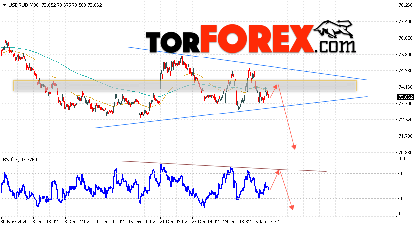 Дополнительным сигналом в пользу снижения валютной пары USD/RUB 8 января 2021 выступит тест линии сопротивления на индикаторе относительной силы. Вторым сигналом станет отскок от верхней границы модели ”Треугольник”. Отменой варианта падения пары USD/RUB на Форекс станет сильный рост и пробой уровня 75.95. Рублей за Доллар. Это укажет на пробой области сопротивления и продолжение подъёма пары Доллар Рубль в область выше уровня 79.05. Подтверждением падения пары выступит пробой области поддержки и закрытие котировок актива под уровнем 72.65, что укажет на завершение формирования модели ”Треугольник”.