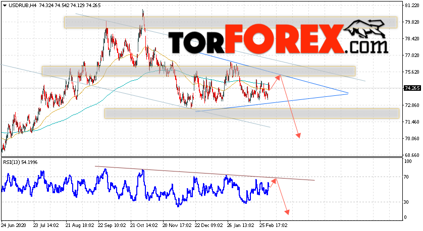 Дополнительным сигналом в пользу падения валютной пары USD/RUB 9 марта 2021 выступит тест линии сопротивления на индикаторе относительной силы. Вторым сигналом станет отскок от верхней границы модели ”Треугольник”. Отменой варианта падения пары USD/RUB на Форекс станет сильный рост и пробой уровня 77.25. Рублей за Доллар. Это укажет на пробой области сопротивления и продолжение роста пары Доллар Рубль в область выше уровня 79.65. Подтверждением падения пары выступит пробой области поддержки и закрытие котировок актива под уровнем 72.45.