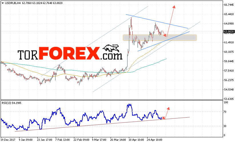 В пользу роста пары USD/RUB выступит тест линии поддержки на индикаторе относительной силы, а также тест нижней границы восходящего канала. Отменой варианта роста пары USD/RUB на Форекс станет падение и пробой уровня 61.50 Рублей за Доллар, что укажет на пробой области поддержки и продолжение падения пары Доллар Рубль в область ниже уровня 60.00. Подтверждением развития восходящей тенденции по паре выступит пробой верхней границы модели «Треугольник» и закрытие котировок выше уровня 64.50.