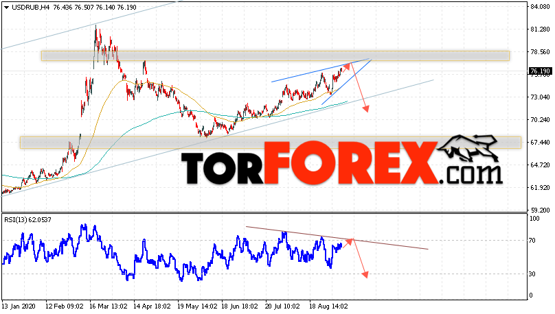 Дополнительным сигналом в пользу снижения валютной пары USD/RUB 9 сентября 2020 выступит тест линии сопротивления на индикаторе относительной силы. Вторым сигналом станет пробой нижней границы восходящего канала. Отменой варианта падения пары USD/RUB на Форекс станет сильный рост и пробой уровня 78.45. Рублей за Доллар. Это укажет на пробой области сопротивления и продолжение роста пары Доллар Рубль в область выше уровня 81.95. Подтверждением падения пары выступит пробой области поддержки и закрытие котировок актива под уровнем 72.85.