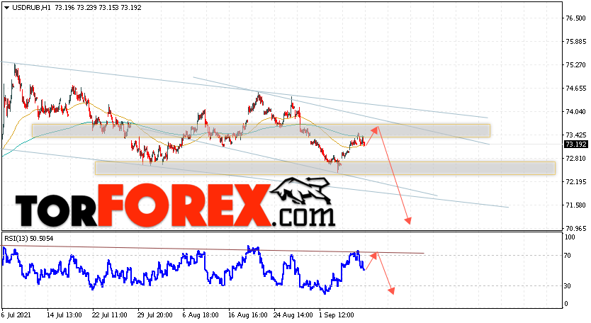 Дополнительным сигналом в пользу падения валютной пары USD/RUB 9 сентября 2021 выступит тест линии тренда на индикаторе относительной силы. Вторым сигналом станет отскок от верхней границы нисходящего канала. Отменой варианта падения пары USD/RUB на Форекс станет сильный рост и пробой уровня 74.55. Рублей за Доллар. Это укажет на пробой области сопротивления и продолжение подъёма пары Доллар Рубль в область выше уровня 77.85. Подтверждением падения пары выступит пробой области поддержки и закрытие котировок актива под уровнем 72.95.