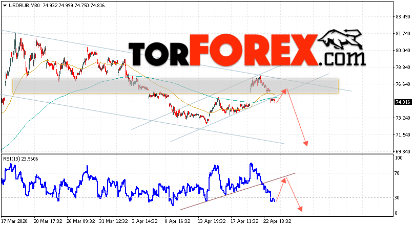 Дополнительным сигналом в пользу падения валютной пары USD/RUB 23 апреля 2020 выступит тест линии сопротивления на индикаторе относительной силы. Вторым сигналом станет отскок от нижней границы восходящего канала. Отменой варианта роста пары USD/RUB на Форекс станет падение и пробой уровня 77.75. Рублей за Доллар. Это укажет на пробой области сопротивления и продолжение подъёма пары Доллар Рубль в область выше уровня 82.05. Подтверждением падения пары выступит пробой области поддержки и закрытие под уровнем 72.25.