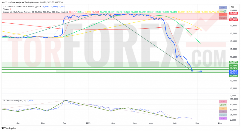 Медвежий сценарий (продолжение снижения): Если текущее давление продавцов сохранится, и цена не сможет отскочить от текущей поддержки или пробивает ее, вероятен пробой вниз ближайшей поддержки 10.2000 – 10.2614 TJS. В таком случае, следующей значимой целью для медведей станет психологический уровень 10.0000 TJS. Устойчивое закрепление ниже 10.2000 TJS будет сильным подтверждением продолжения нисходящего тренда. Усиление медвежьего импульса будет подтверждено дальнейшим падением индикатора и пробоем ключевых поддержек.