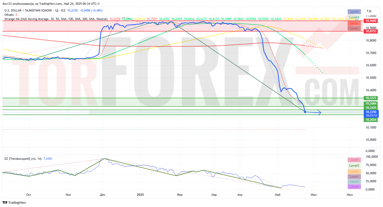 Текущая цена 10.2250 TJS находится в сильной медвежьей зоне, вблизи ближайшей поддержки, что создает предпосылки как для продолжения снижения, так и для локального отскока к ближайшим сопротивлениям.