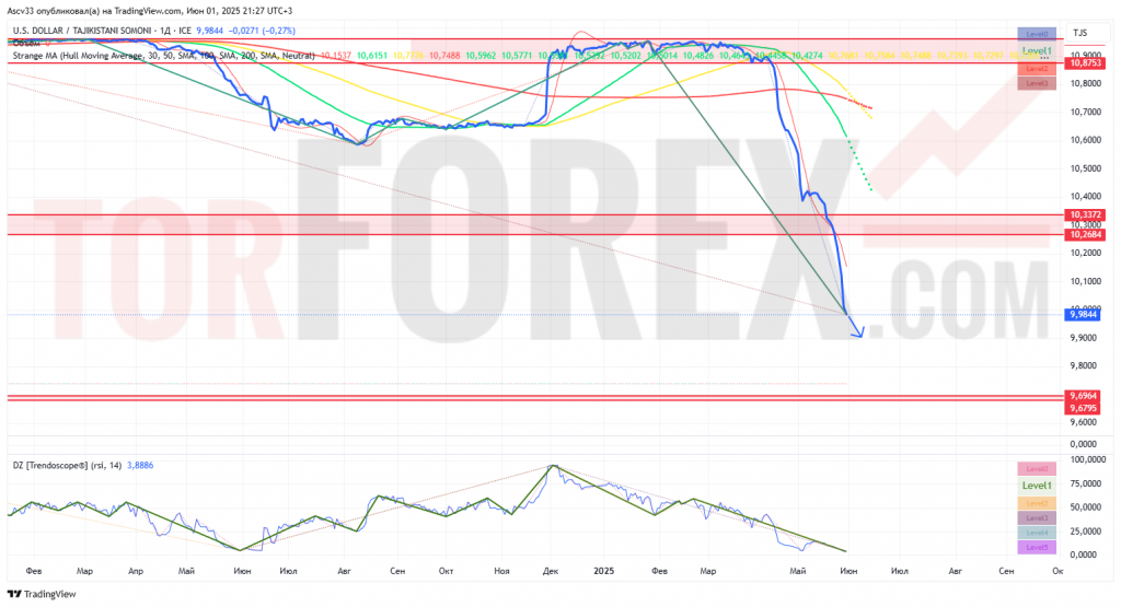 Пара USD/TJS находится в стадии агрессивного нисходящего тренда. Технические и индикаторные сигналы указывают на преобладание продавцов. Несмотря на экстремальную перепроданность, пока рано говорить о развороте — отсутствуют подтверждающие сигналы.
