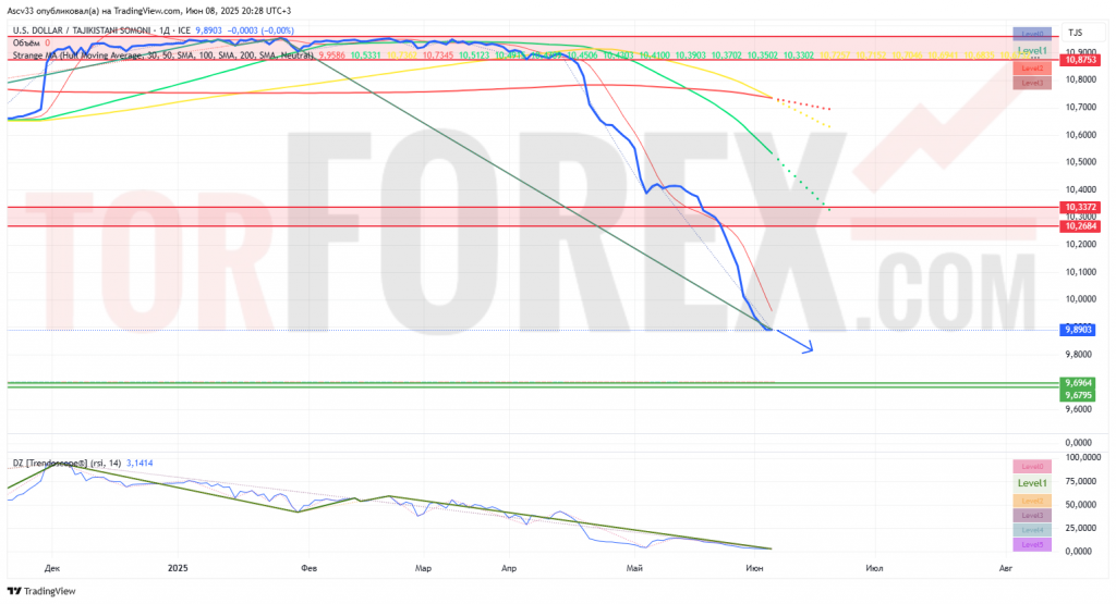 Пара USD/TJS продолжает уверенное снижение с начала весны и на текущий момент торгуется вблизи отметки 9,89 — минимальных значений за последние месяцы. Давление на доллар сохраняется, а структура графика указывает на возможность дальнейшего снижения к следующим уровням поддержки.