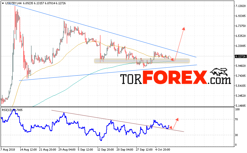 Валютная пара Доллар США к Турецкой Лире USD/TRY продолжает движение в рамках формирования модели «Треугольник». В момент публикации прогноза курс Доллара США к Турецкой Лире составляет 6.12. На данный момент стоит ожидать попытку теста уровня поддержки вблизи области 6.10 и продолжения роста пары в область выше уровня 6.70.