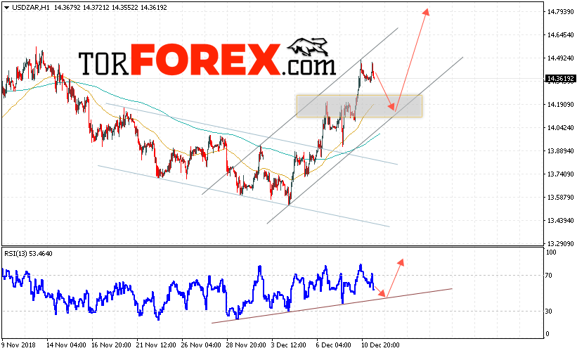 Таким образом, USD/ZAR прогноз Южноафриканский Ранд на 12 декабря 2018 предполагает попытку теста области поддержки вблизи уровня 14.15. Далее, продолжение роста в область выше уровня 14.80. Дополнительным сигналом в пользу роста пары на Форекс выступит тест линии тренда на индикаторе относительной силы. Отменой варианта роста Доллара США против Южноафриканского Ранда станет падение и пробой уровня 13.95.