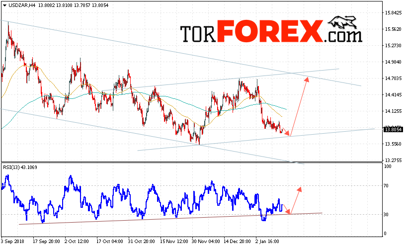 В пользу роста котировок Южноафриканский Ранд выступит пробой нисходящей линии тренда на индикаторе относительной силы. Отменой варианта роста USD/ZAR на Форекс станет падение и пробой области 13.55. Это укажет на пробой нижней границы канала и продолжение снижения котировок в область ниже уровня 13.05. Ожидать подтверждение роста пары стоит с пробоем области сопротивления и закрытием котировок пары USD/ZAR выше уровня 14.15.