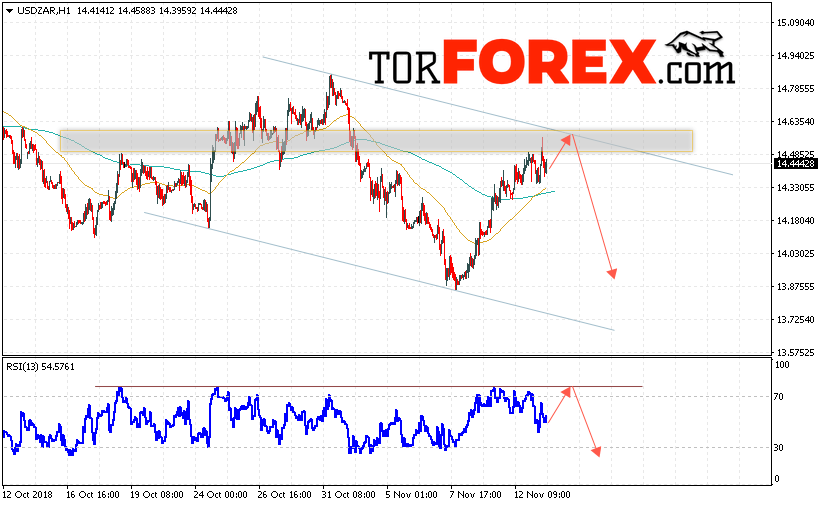 Таким образом, USD/ZAR прогноз Южноафриканский Ранд на 14 ноября 2018 предполагает попытку теста области сопротивления вблизи уровня 14.55. Затем продолжение снижения в область ниже уровня 13.85. Дополнительным сигналом в пользу падения пары на Форекс выступит тест линии тренда на индикаторе относительной силы. Отменой варианта падения Доллара США против Южноафриканского Ранда станет сильный рост и пробой уровня 14.80.