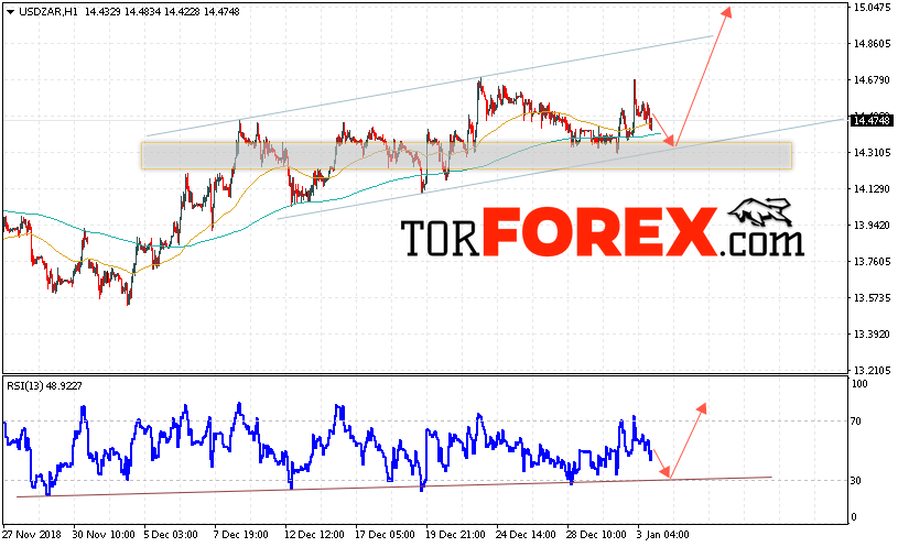 Таким образом, USD/ZAR прогноз Южноафриканский Ранд на 4 января 2019 предполагает попытку теста области поддержки вблизи уровня 14.30. Далее, продолжение роста в область выше уровня 15.05. Дополнительным сигналом в пользу роста пары на Форекс выступит тест линии тренда на индикаторе относительной силы. Отменой варианта роста Доллара США против Южноафриканского Ранда станет падение и пробой уровня 14.10.