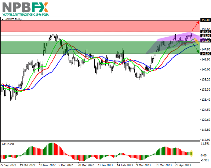 Акции Walmart Inc., американской компании, управляющей крупнейшей мировой сетью оптовой и розничной торговли, находятся на уровне 153.00.