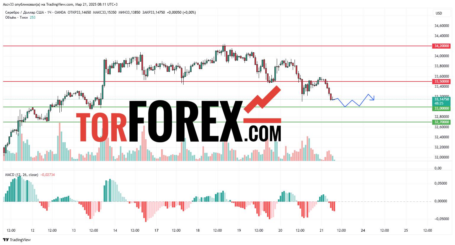 - 33,50 USD – преодоление этого уровня может укрепить бычий тренд и открыть путь к 34,20 USD.
