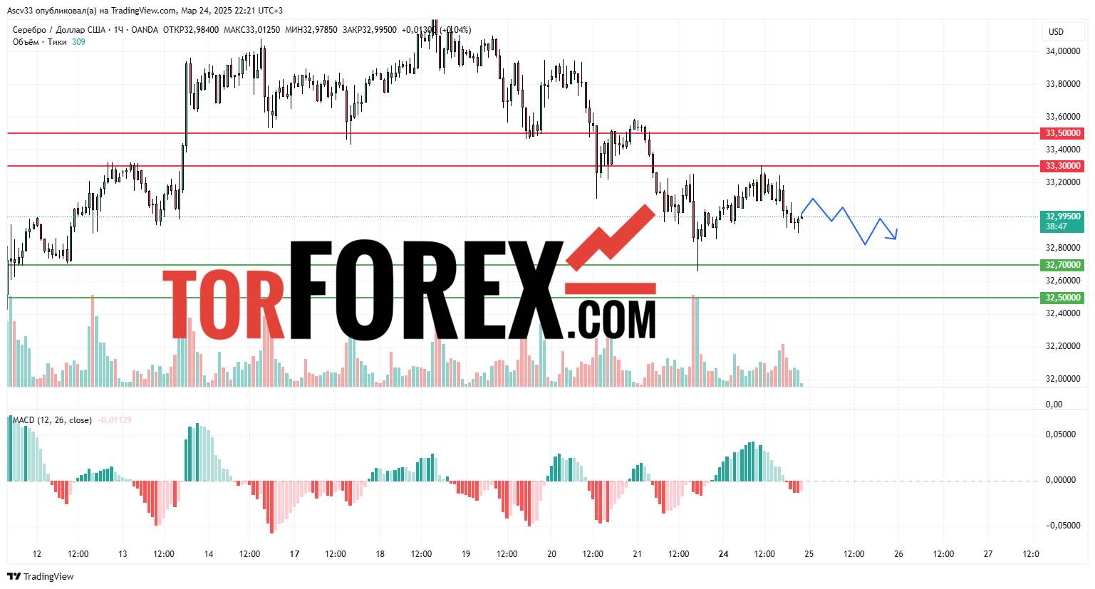 Ожидается, что XAG/USD будет находиться в диапазоне 32,70–33,30 USD на 25 марта. Пробой 33,30 USD вверх подтвердит восходящее движение, тогда как закрытие ниже 32,70 USD может усилить медвежьи настроения. Трейдерам рекомендуется внимательно следить за изменениями курса вблизи этих ключевых уровней, поскольку их прорыв может значительно повлиять на дальнейшие действия на рынке серебра.