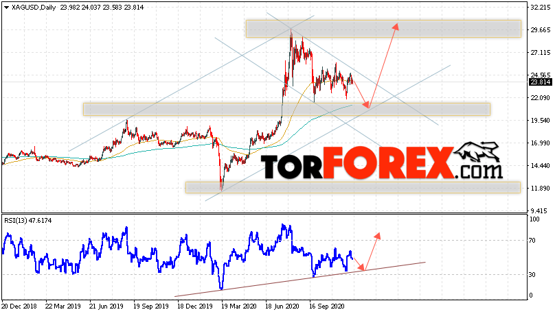 Таким образом, XAG/USD прогноз цен на Серебро на 14 — 18 декабря 2020 предполагает попытку теста уровня поддержки вблизи области 21.65. Затем, продолжение роста цен на Серебро с целью выше уровня 29.65. В пользу подъёма выступит тест линии тренда на индикаторе относительной силы. Отменой варианта роста XAG/USD станет падение и пробой уровня 17.35. Это укажет на продолжение снижения котировок в область ниже уровня 14.35.