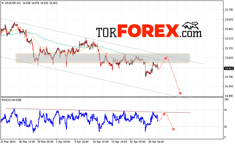 В пользу снижения котировок XAG/USD выступит тест нисходящей линии тренда на индикаторе относительной силы. Вторым сигналом станет отскок от верхней границы нисходящего канала. Отменой варианта падения цен на Серебра 26 апреля 2019 станет сильный рост и пробой 15.20. Это укажет на пробой верхней границы канала и продолжение роста в область выше уровня 15.75. Ожидать ускорения падения котировок XAG/USD стоит с пробоем области поддержки и закрытием ниже уровня 14.65.