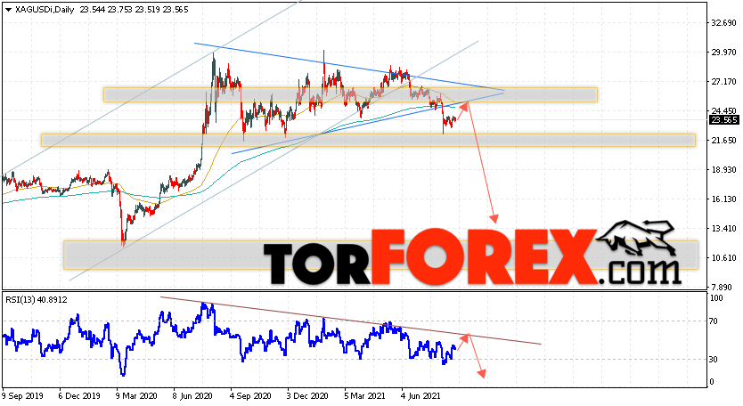 Таким образом, XAG/USD прогноз цен на Серебро на 30 августа — 3 сентября 2021 предполагает попытку теста уровня сопротивления вблизи области 24.55. Затем, продолжение падения цен на Серебро с целью ниже уровня 13.55. В пользу снижения выступит тест линии тренда на индикаторе относительной силы. Отменой варианта падения XAG/USD станет сильный рост и пробой уровня 28.35. Это укажет на продолжение подъёма котировок в область выше уровня 32.55.