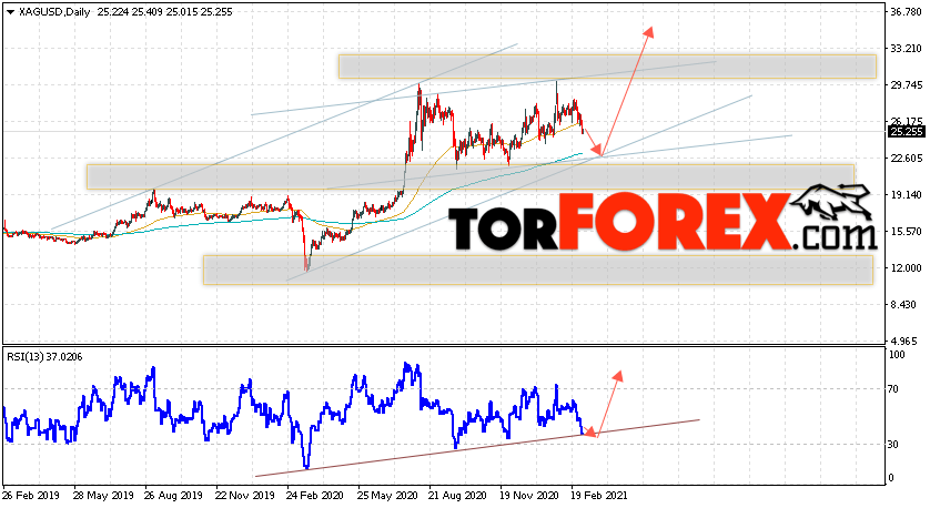 Таким образом, XAG/USD прогноз цен на Серебро на 8 — 12 марта 2021 предполагает попытку теста уровня поддержки вблизи области 22.65. Затем, продолжение роста цен на Серебро с целью выше уровня 34.65. В пользу подъёма выступит тест линии тренда на индикаторе относительной силы. Отменой варианта роста XAG/USD станет падение и пробой уровня 19.25. Это укажет на продолжение снижения котировок в область ниже уровня 14.55.