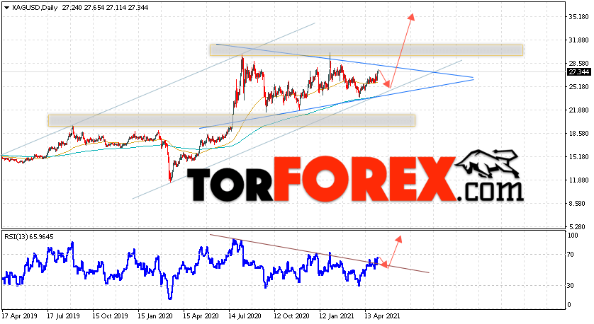 В пользу роста котировок и цен на Серебро на текущей торговой неделе 10 — 14 мая 2021 выступит отскок от линии поддержки на индикаторе относительной силы. Вторым сигналом станет отскок от нижней границы модели ”Треугольник”. Отменой варианта подъёма котировок XAG/USD выступит падение и пробой области 21.55. Это укажет на пробой области поддержки и продолжение падения цен на Серебро с целью ниже уровня 15.95. Подтверждением развития роста выступит пробой уровня сопротивления и закрытие цен выше уровня 29.85, что укажет на пробой верхней границы модели ”Треугольник”.