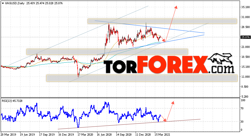 В пользу роста котировок и цен на Серебро на текущей торговой неделе 12 — 16 апреля 2021 выступит отскок от линии поддержки на индикаторе относительной силы. Вторым сигналом станет отскок от нижней границы модели ”Треугольник”. Отменой варианта подъёма котировок XAG/USD выступит падение и пробой области 20.55. Это укажет на пробой области поддержки и продолжение падения цен на Серебро с целью ниже уровня 15.95. Подтверждением развития роста выступит пробой уровня сопротивления и закрытие цен выше уровня 29.65, что укажет на пробой верхней границы модели ”Треугольник”.