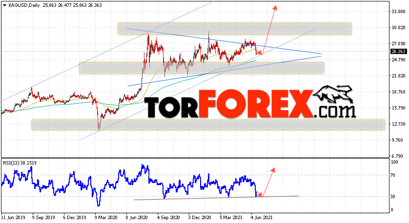 Таким образом, XAG/USD прогноз цен на Серебро на неделю 21 — 25 июня 2021 предполагает попытку теста уровня поддержки вблизи области 25.75. Затем, продолжение роста цен на Серебро с целью выше уровня 35.05. В пользу подъёма выступит тест линии тренда на индикаторе относительной силы. Отменой варианта роста XAG/USD станет падение и пробой уровня 21.95. Это укажет на продолжение снижения котировок в область ниже уровня 17.55.