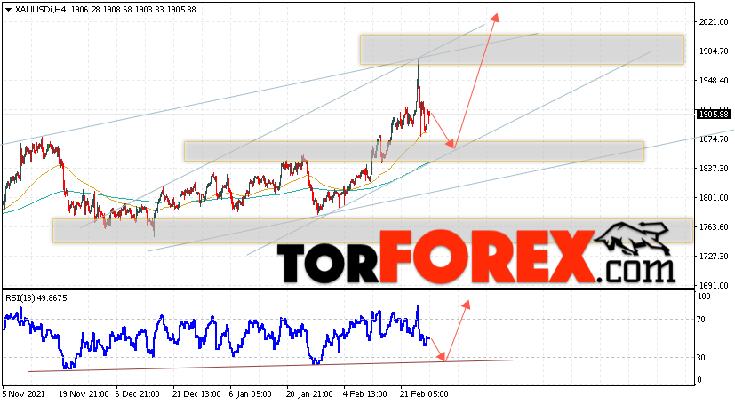 Дополнительным сигналом в пользу роста котировок XAU/USD выступит тест линии сопротивления на индикаторе относительной силы. Вторым сигналом станет отскок от нижней границы бычьего канала. Отменой варианта роста цен на Золото 1 марта 2022 станет падение и пробой уровня 1835. Это укажет на пробой области поддержки и продолжение падения в область ниже уровня 1785. Ожидать ускорения подъёма котировок XAU/USD стоит с пробоем области сопротивления и закрытием цены над уровнем 1995, что укажет на пробой верхней границы бычьего канала.