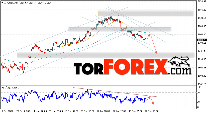 Дополнительным сигналом в пользу снижения котировок XAU/USD выступит тест линии сопротивления на индикаторе относительной силы. Вторым сигналом станет отскок от верхней границы нисходящего канала. Отменой варианта падения цен на Золото 1 марта 2023 станет сильный рост и пробой уровня 1865. Это укажет на пробой области сопротивления и продолжение роста в область выше уровня 1925. Ожидать ускорения падения котировок XAU/USD стоит с пробоем области поддержки и закрытием цены под уровнем 1785, что укажет на пробой нижней границы нисходящего канала.