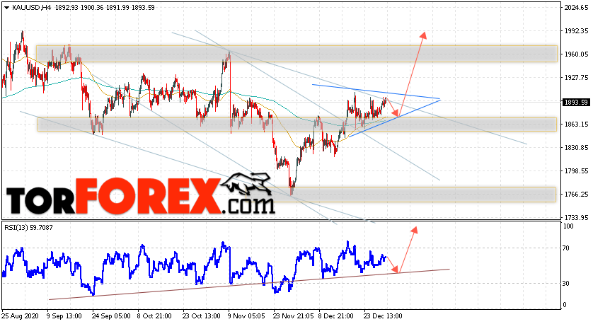 Дополнительным сигналом в пользу подъёма котировок XAU/USD выступит тест линии поддержки на индикаторе относительной силы. Вторым сигналом станет отскок от нижней границы модели ”Треугольник”. Отменой варианта роста цен на Золото 1 января 2021 станет падение и пробой уровня 1835. Это укажет на пробой области поддержки и продолжение падения в область ниже уровня 1790. Ожидать ускорения роста котировок XAU/USD стоит с пробоем области сопротивления и закрытием цены над уровнем 1905.