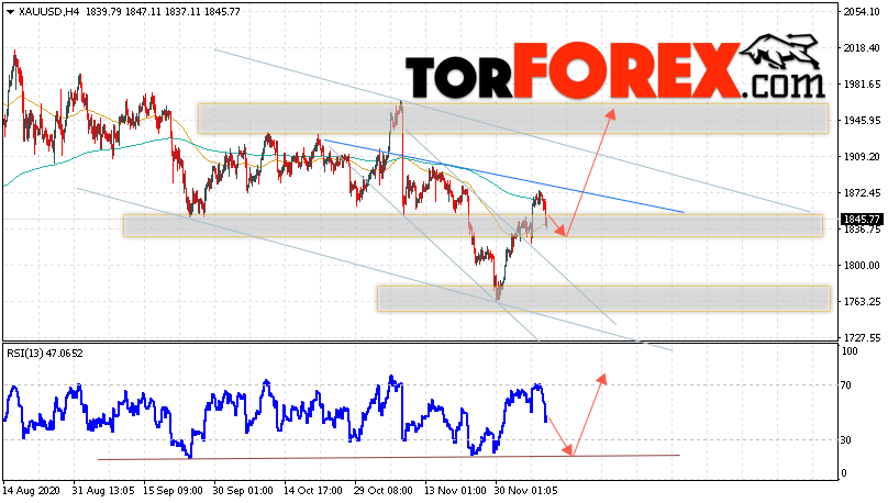 Дополнительным сигналом в пользу роста котировок XAU/USD выступит тест линии поддержки на индикаторе относительной силы. Вторым сигналом станет завершение формирования разворотной модели ”Голова и плечи”. Отменой варианта роста цен на Золото 10 декабря 2020 станет падение и пробой уровня 1800. Это укажет на пробой области поддержки и продолжение падения в область ниже уровня 1755. Ожидать ускорения роста котировок XAU/USD стоит с пробоем области сопротивления и закрытием цены над уровнем 1895.
